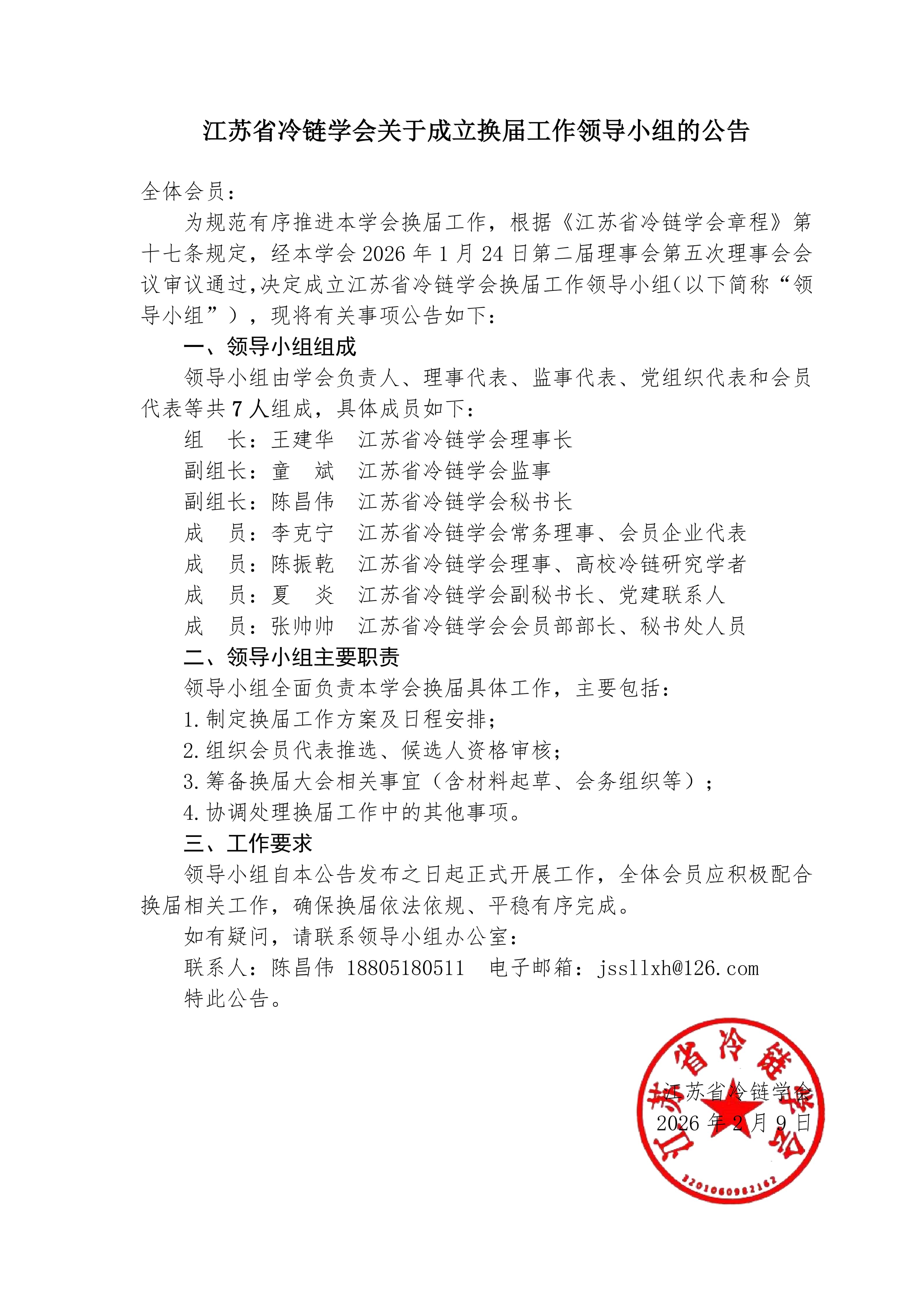 江苏省冷链学会关于成立换届工作领导小组的公告