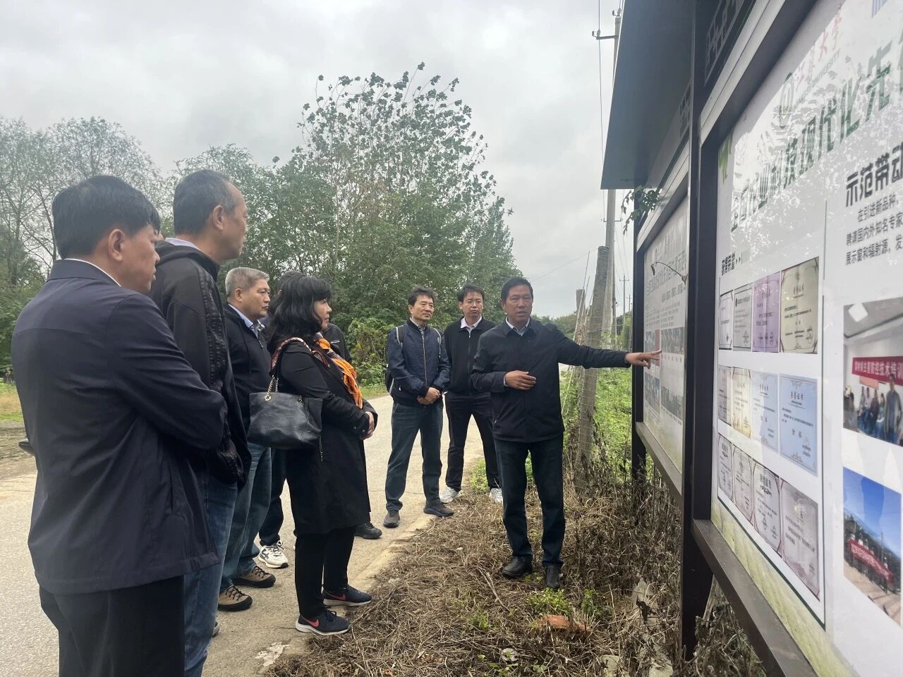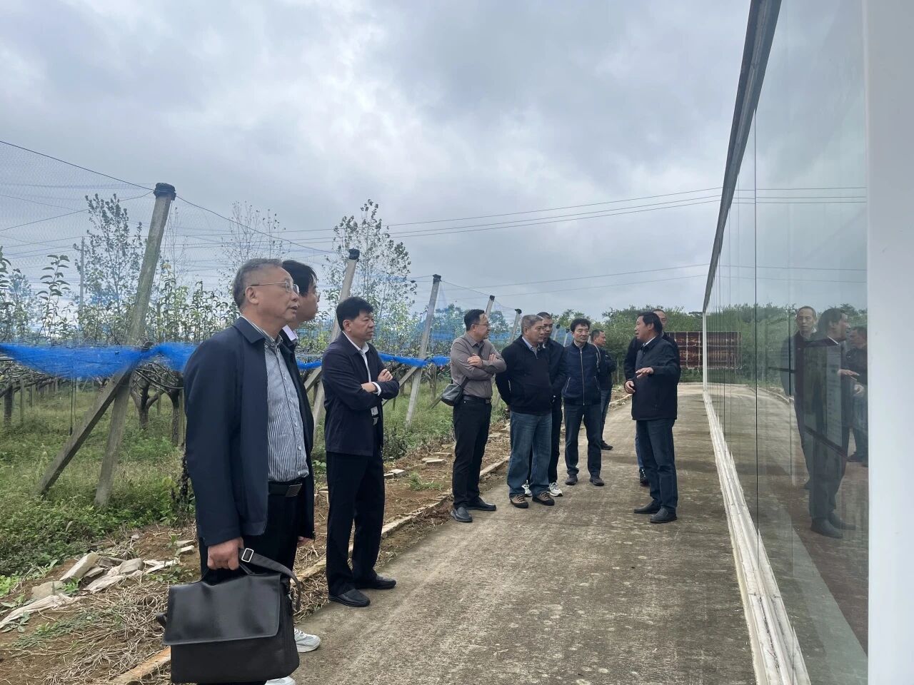 一行人实地考察梨园,园内苏翠 1 号、丰水等品种丰富,运用病虫害绿色防控等新技术,采用 “果草禽” 共作等新模式,配备智能化水肥一体化设备等新装备,现代农业气息浓厚。